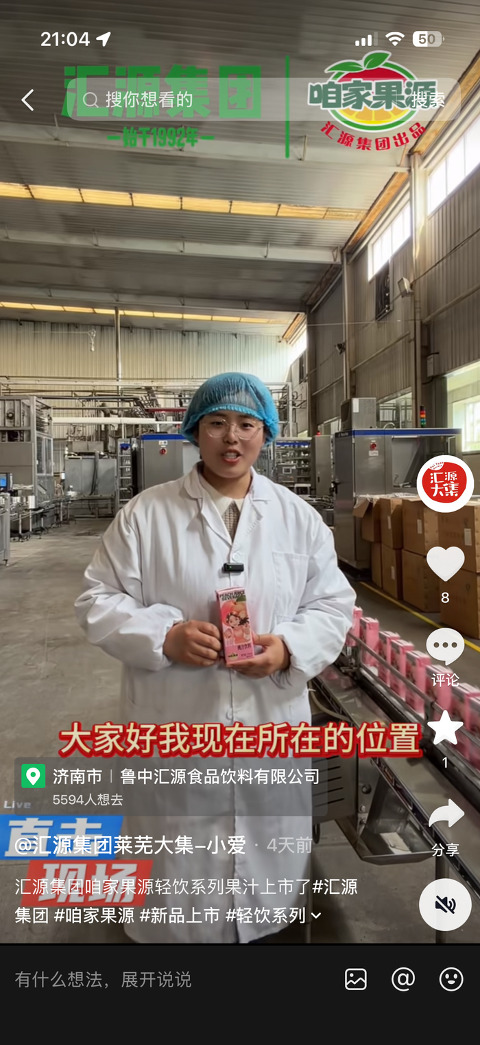 在失去“汇源”主品牌控制权后,留守工厂的创始团队将重心转向了新品牌。新黄河记者在电商平台和短视频平台上观察到,一个名为“咱家果源企业店”的直播间近期正频繁推销一款新年限定款纯果汁,包装上仍出现“汇源集团出品”等字样,试图维持市场认知。在3月下旬汇源集团发布的一段推广视频中,特意打出了“好果汁不代工”的标题。