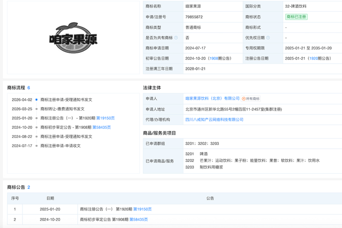 新黄河记者进一步查询知识产权信息发现,“咱家果源”的品牌防御显得极为仓促。目前由该公司持有的核心第32类(啤酒饮料)“咱家果源”商标,实际上是在今年3月20日刚刚从一位名叫关坤鹏的自然人手中转让取得。该品牌的第29类(食品)和第35类(广告销售)等关键保护商标,目前仍滞留在这位自然人名下。这种匆忙“买标”且知识产权归属尚存漏洞的做法,也从侧面反映出原管理团队在失去主品牌后的处境。