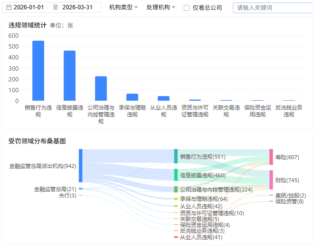 从罚单出具主体来看,一季度保险业罚单主要由国家金融监督管理总局派出机构作出,地域分布上,吉林、广东两地被罚次数位居全国前列,成为保险违规行为高发区域。从违规案由来看,保险机构违规事项呈现高度集中特征,销售行为违规、信息披露违规成为行业两大踩雷的“重灾区”,两类违规对应的一季度罚单数量分别为561张、471张。