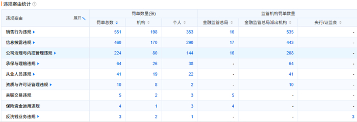 除此之外,一季度披露的违规案由中,公司治理与内控管理违规罚单数量共有228张。其中机构罚单82张,个人罚单146张。而上年同期公司治理与内控管理违规罚单共计173张,其中机构罚单81张、个人罚单92张。对比来看,今年一季度相关从业人员追责处罚占比显著提升。