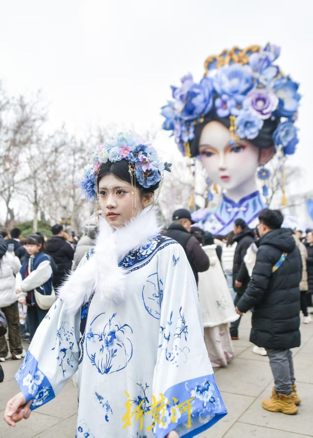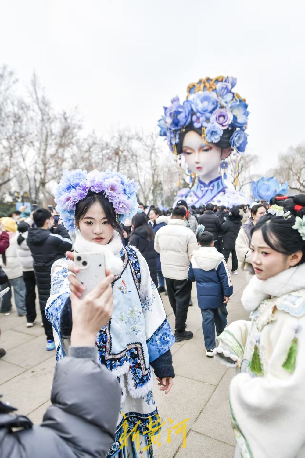 虽然花灯白天没有亮灯,依然吸引了众多游客前来观赏,还有不少女生身穿特色服饰,头戴蓝紫色簪花,打扮成与明湖雨荷花灯相同的服饰造型,站在花灯前打卡拍照。