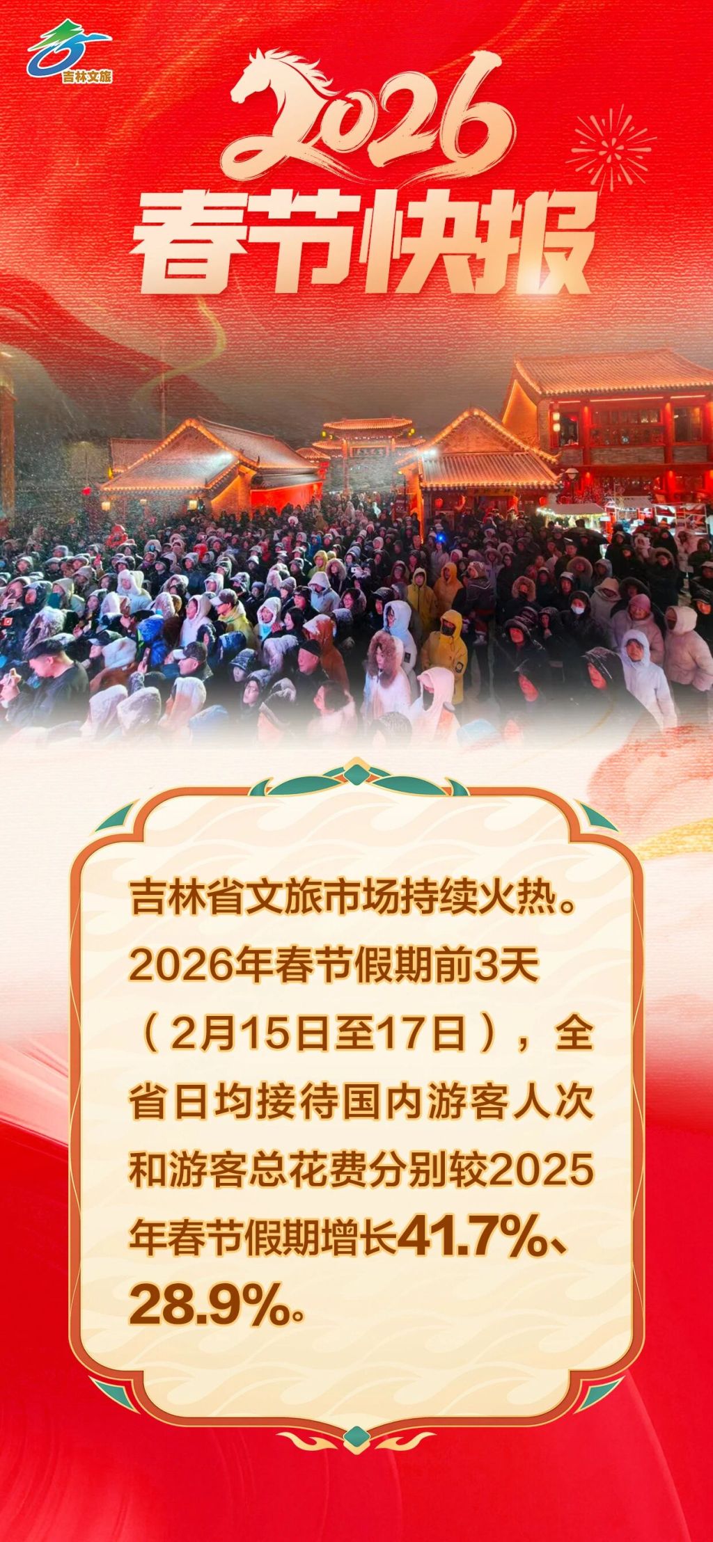 吉林省文旅厅披露的数据显示,2026年春节假期前3天迎客创新高:吉林省接待国内游客人次和旅游总花费分别较2025年春节假期增长41.7%、28.9%。