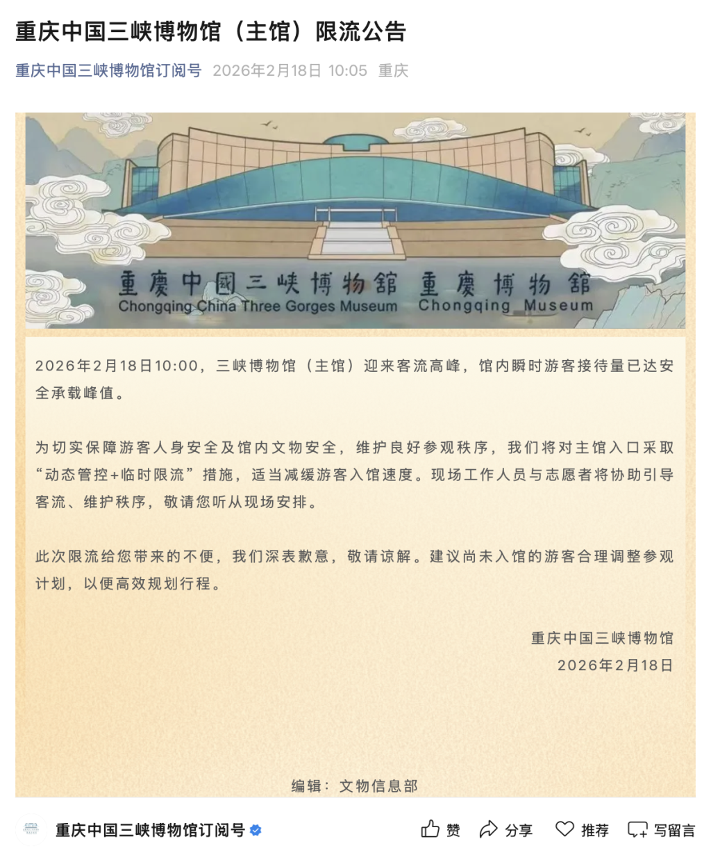 重庆中国三峡博物馆通知,当日10:00,三峡博物馆(主馆)迎来客流高峰,馆内瞬时游客接待量已达安全承载峰值。博物馆对主馆入口采取 “动态管控+临时限流” 措施,适当减缓游客入馆速度。