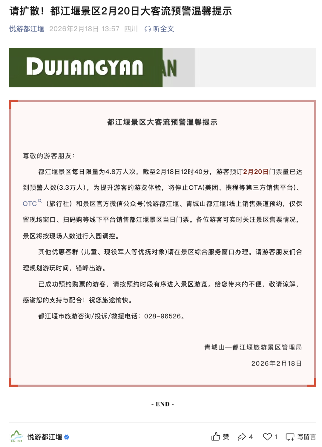 青城山—都江堰旅游景区管理局发布的消息显示,截至2月18日12时40分,游客预订2月20日门票量已达到预警人数,为提升游客的游览体验,将停止OTA、OTC(旅行社)和景区官方微信公众号线上销售渠道预约,仅保留现场窗口、扫码购等线下平台销售都江堰景区当日门票。