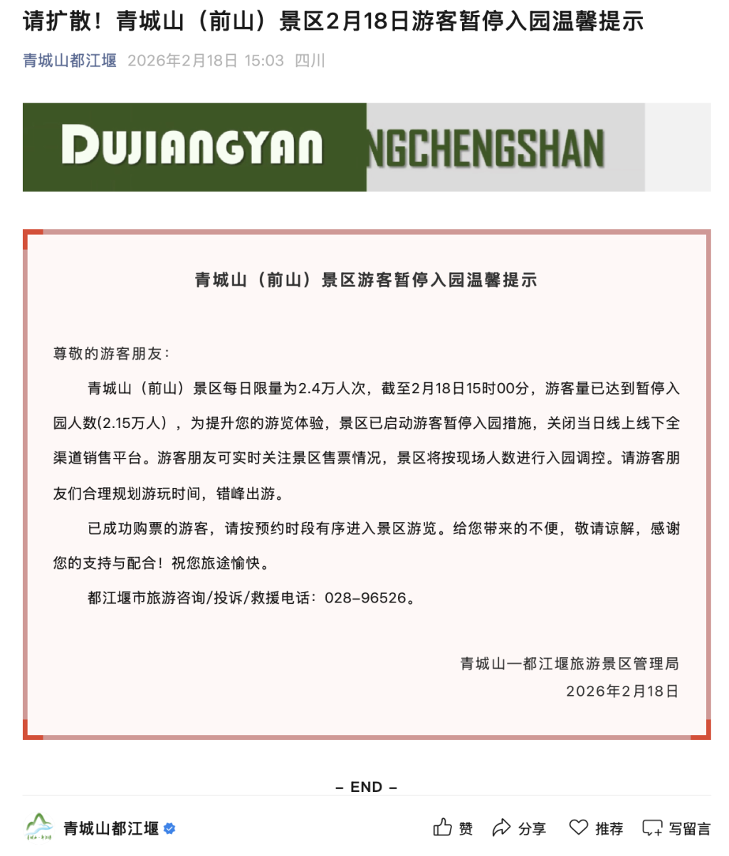 截至当日15:00,青城山(前山)景区游客量已达到暂停入园人数,景区启动游客暂停入园措施,关闭线上线下全渠道销售平台。