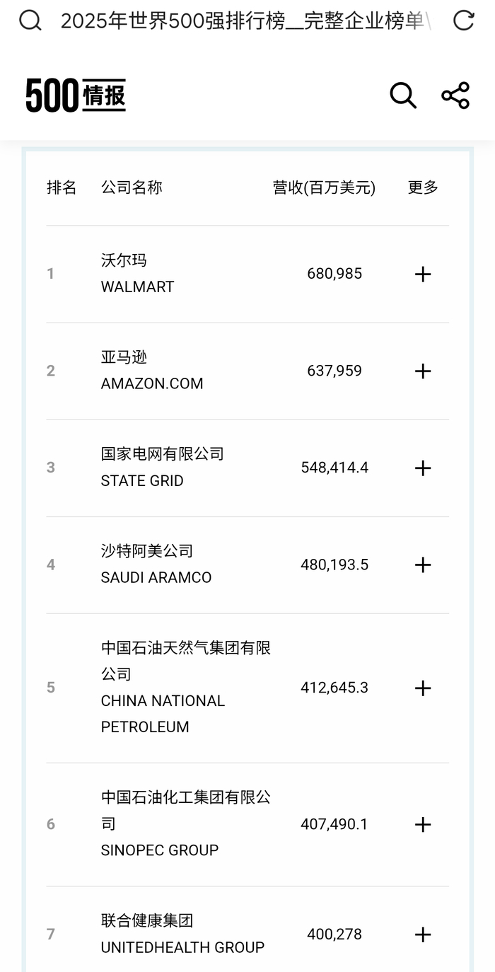 7月29日下午,财富中文网同步全球发布了最新的《财富》世界500强排行榜。前六位中有三家中国企业,国家电网公司继续位列第三,中国石油则排在第五位,其次是中国石化。沃尔玛则连续第十二年成为全球最大公司,亚马逊保持第二,沙特阿美为第四。