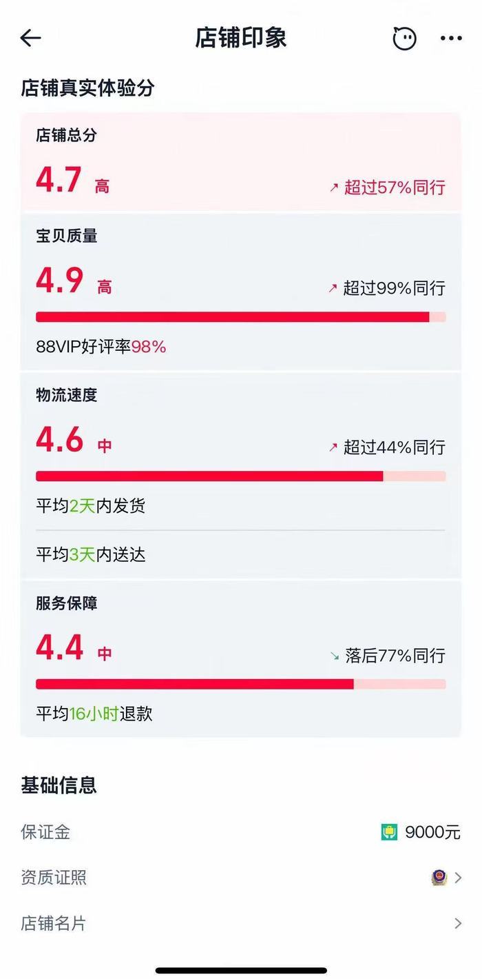 戎美淘宝店铺的数据显示,其“宝贝质量”评分高达4.9分,超过99%的同行。但其“服务保障”评分仅为4.4分,落后77%的同行。
