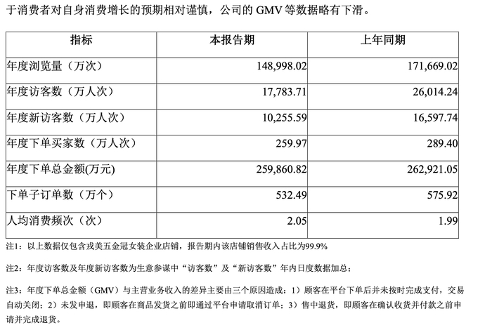 与此同时,最终转化为销售的下单买家数也从289.40万人次降至259.97万人次。对于数据的下滑,戎美股份在财报中给出了解释。公司称,浏览量和访客数的下降是由于“优化了推广方式,节约了推广费”所致,而GMV的下滑则归因于“消费者对自身消费增长的预期相对谨慎”。
