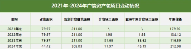 为了更好拆解资产包,2020年6月,万科采用“股权+债权”的交易方式引进了以信达为首的七家战略投资者,转让出广州市万溪企业的50%股权。近年来,广州万溪将部分原本低效利用或者闲置的土地进行了整合、置换等操作,因此相较2021年末,广信资产包项目在2024年底的占地面积已减少了44.45%,但同时,规划计容建筑面积提升了44.56%。