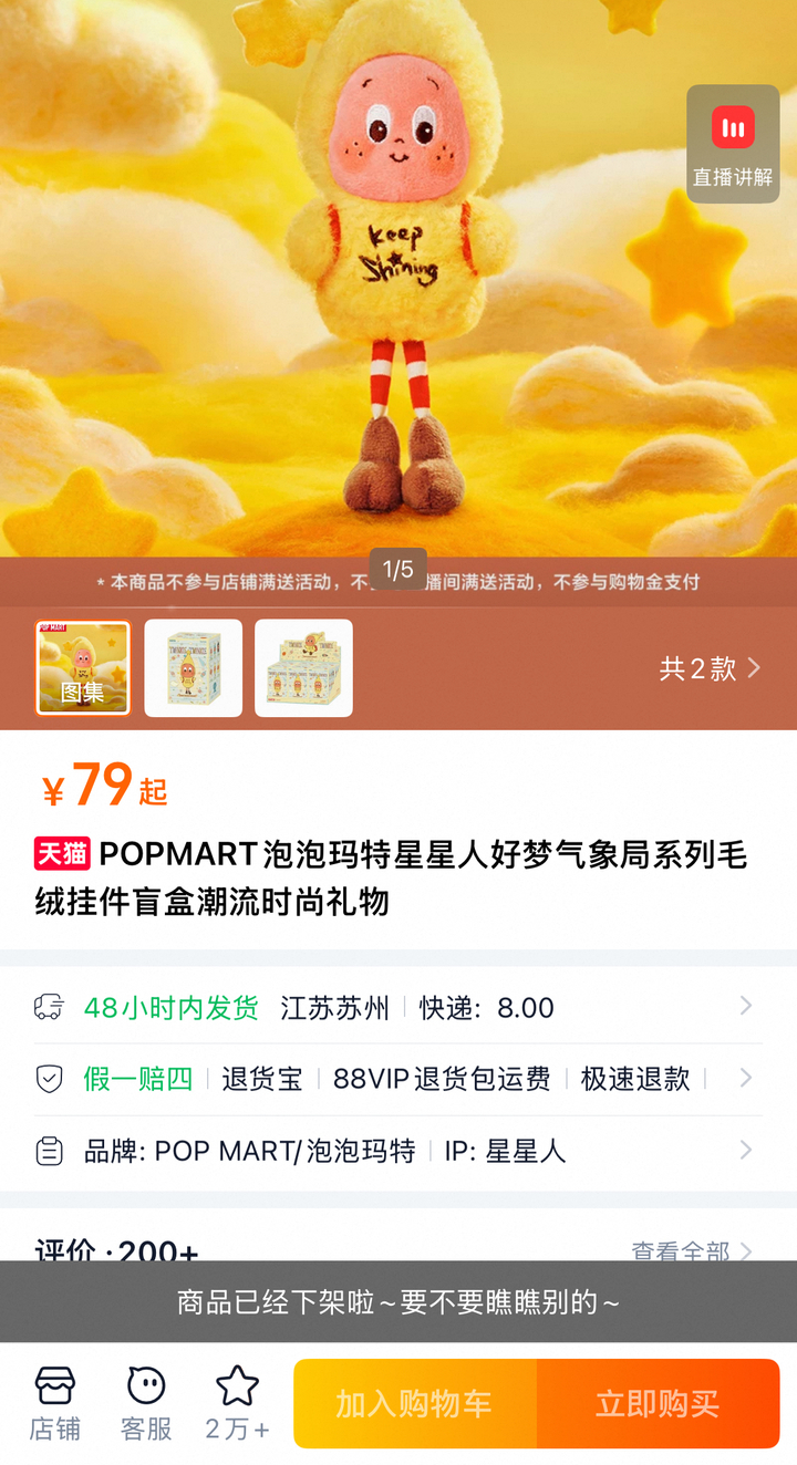 9月29日22时,泡泡玛特“星星人美味时刻系列”正式开抢,多个电商平台瞬时陷入拥堵,全系列盲盒、挂件在数秒内售罄,“新品遭疯抢”再次展现了用户对星星人IP的喜爱。当晚,不仅泡泡玛特天猫官方旗舰店的主播多次强调“库存以开售情况为准”,泡泡玛特抽盒机也一度“挤不进去”。