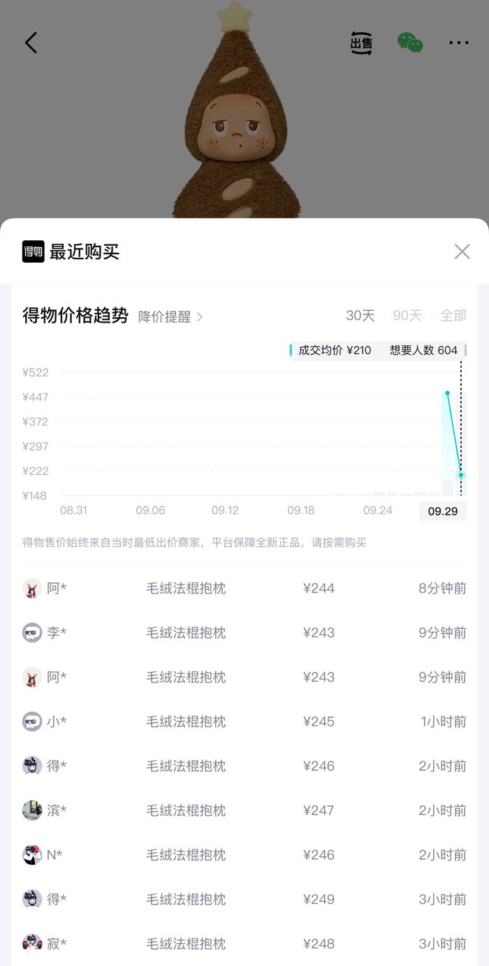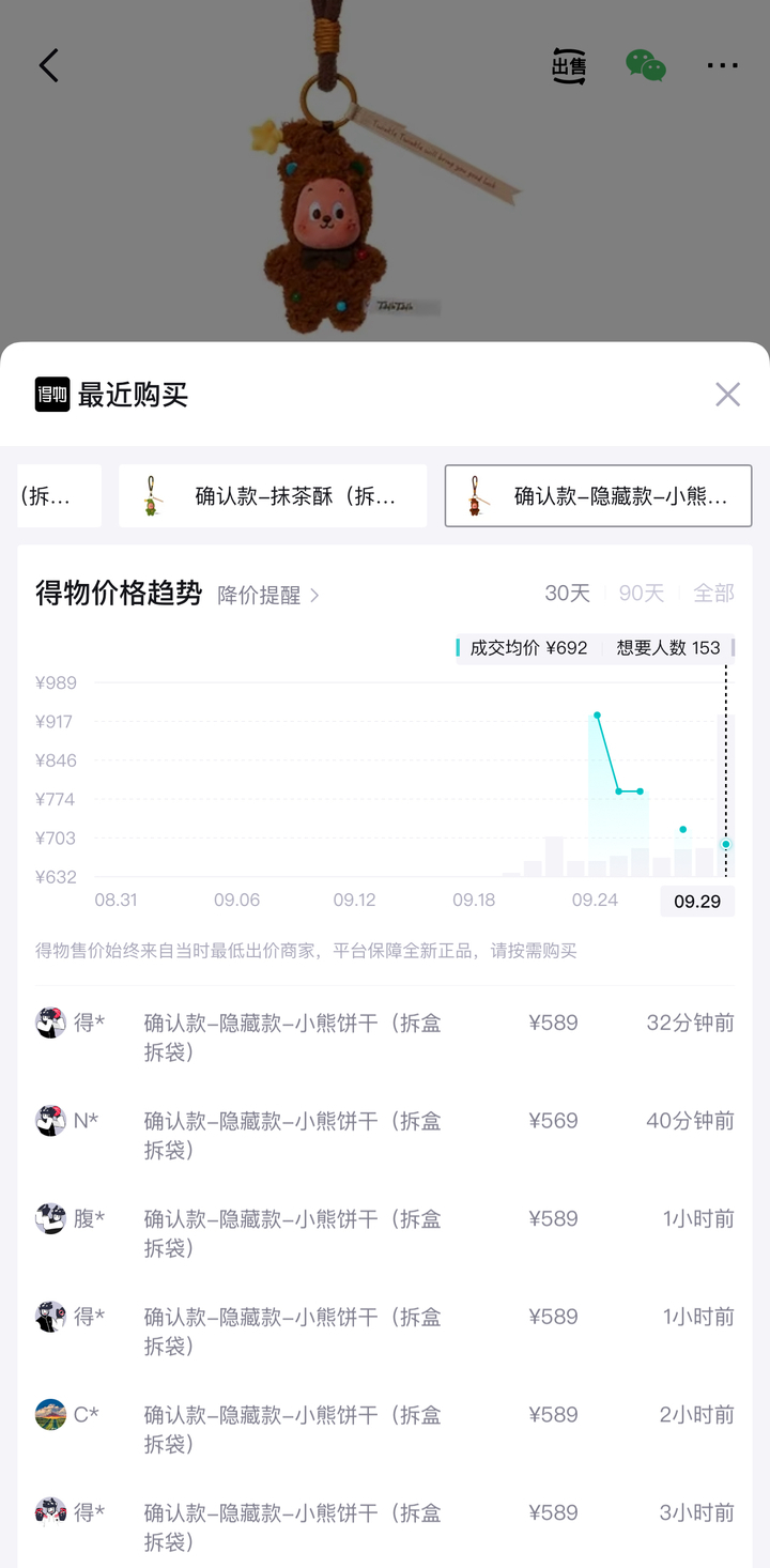 星星人“美味时刻系列现烤饼干”毛绒挂件非常受欢迎,得物App数据显示,隐藏款“小熊饼干”最高成交价从59元上涨至929元,溢价近15倍,是近期溢价最高的系列;单个盲盒成交价从59元上涨至249元,溢价3.2倍;整盒成交价从354元上涨至1319元,溢价2.7倍;成交热度TOP3分别为“香草脆”“抹茶酥”“咸曲奇”,溢价均超过5倍,热度最低的“甜奶油”溢价也达到了5倍。在得物App上,有超9000用户“想要”。