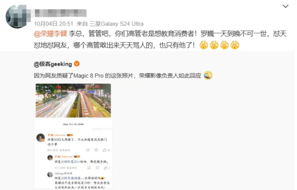 而荣耀Magic8 Pro拍摄的夜景照片翻车,以及罗巍此次的辱骂网友舆论风波,或许将对该产品的发售带来一定的不利影响。
