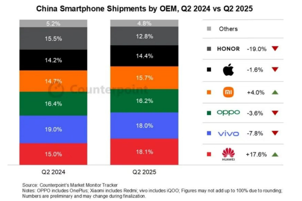 根据调研机构CounterPoint Research发布的最新报告,今年第二季度中国智能手机市场出货量前五名分别为华为、vivo、OPPO、小米和苹果,而荣耀则排名第六,出货量同比下降19%。这意味着荣耀要在今年重返国内市场前三,仍需努力。