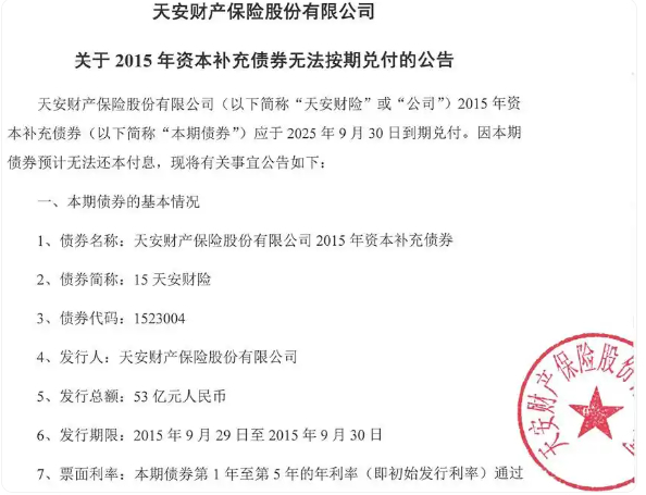 近日,天安财险发布的《关于2015年资本补充债券无法按期兑付的公告》显示,该公司一笔53亿元资本补充债“15天安财险”当日到期后,因偿付能力不足,预计无法还本付息。
