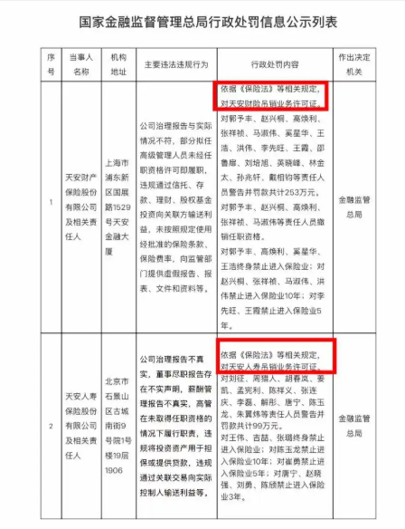 不过,今年6月,国家金融监督管理总局披露,天安财产保险股份有限公司及相关责任人因公司治理报告与实际情况不符,部分拟任高级管理人员未经任职资格许可即履职,违规通过信托、存款、理财、股权基金投资向关联方输送利益,未按照规定使用经批准的保险条款、保险费率,向监管部门提供虚假报告、报表、文件和资料等被罚。