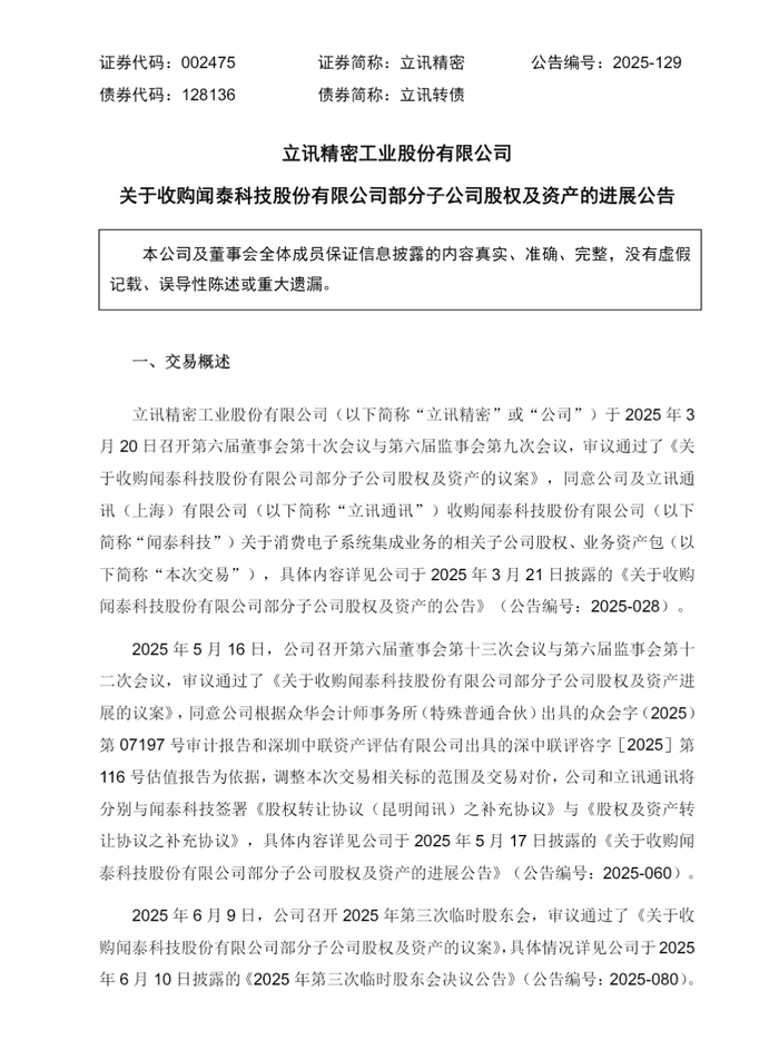目前,香港闻泰、印尼闻泰已依协议于2025年9月16日完成股权实质性交割并纳入立讯精密合并财务报表范围,印度闻泰相关业务资产包部分资产权属转移手续虽仍在办理,但部分已由立讯精密接手运营管理,收购已接近收官阶段。