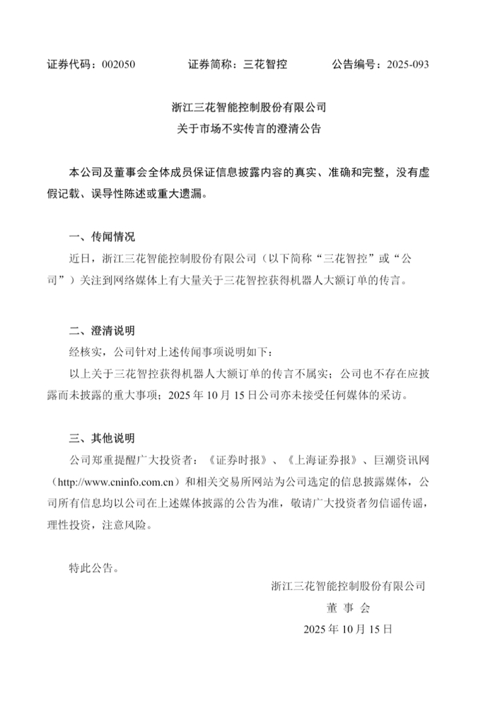 10月15日晚间,浙江三花智控(002050.SZ)发布澄清公告,针对近期网络上关于公司获得机器人大额订单的传言进行了辟谣。公告称,经核实,相关传言不属实,公司也不存在应披露而未披露的重大事项,同时10月15日公司未接受任何媒体采访。