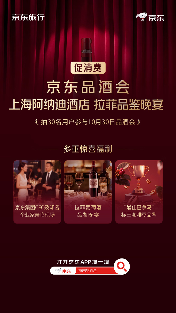 继9月16日首场京东品酒会爆火,官宣24小时百万人涌入活动会场后,时值京东11.11期间,第二场京东品酒会即将来袭。10月30日,京东旅行将在上海阿纳迪酒店举办第二场品酒会,京东集团SEC副主席、京东集团CEO许冉及其他知名企业家现身现场,和用户一起“品名酒,交朋友”。