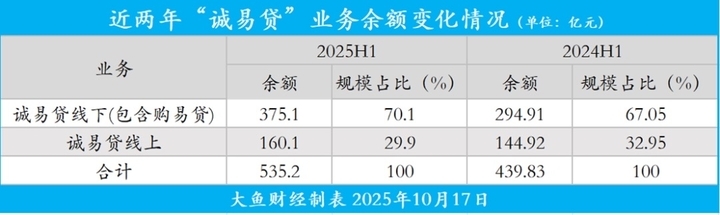 截至2025年6月末,南银法巴消金“诚易贷”线下业务余额(包含购易贷)为375.1亿元,占总贷款规模的70.1%,较去年同期上升了3.05个百分点。而线上业务余额为160.1亿元,占总规模比重为29.9%,较去年同期下滑了3.05个百分点。