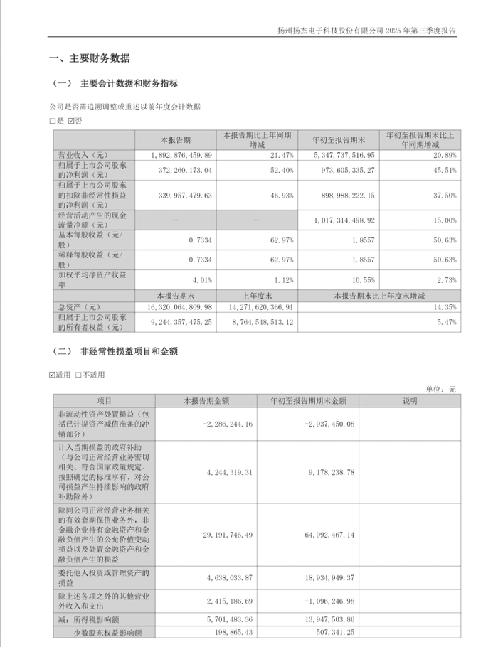 10月20日早间,扬杰科技(300373.SZ)通过巨潮资讯网发布2025年三季度报,实现了营收净利双增长。其中,前三季度实现营业收入53.48亿元,同比增长20.89%;归母净利润达9.74亿元,同比大增45.51%。
