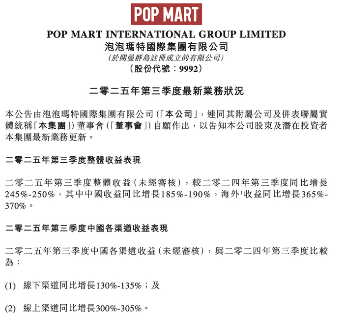 10月21日盘后,潮玩巨头泡泡玛特(09992.HK)披露的2025年第三季度业务数据引发市场强烈关注。数据显示,公司当季实现同比245%~250%的整体收益增长,其中美洲市场同比增幅高达1265%~1270%,欧洲地区增长735%~740%,海外业务正成为公司重要的增长引擎。有投资者评论称,“世界的泡泡玛特初步建成”。
