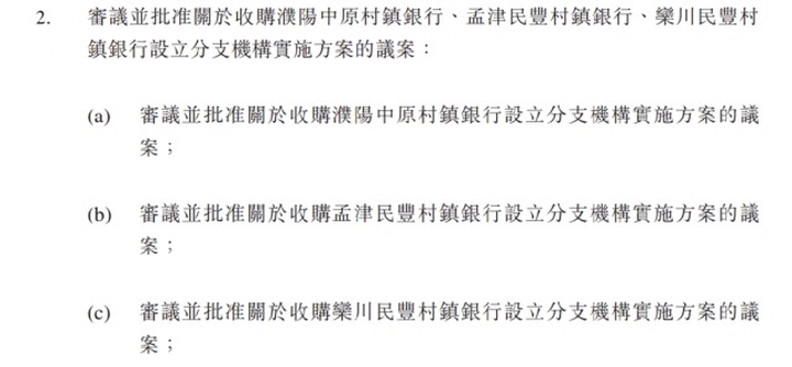 公告显示,收购股权数量方面,该行拟收购濮阳中原村镇银行、孟津民丰村镇银行、栾川民丰村镇银行的其他股东分别持有的0.29亿股、0.98亿股、1.06亿股股权。