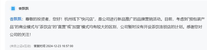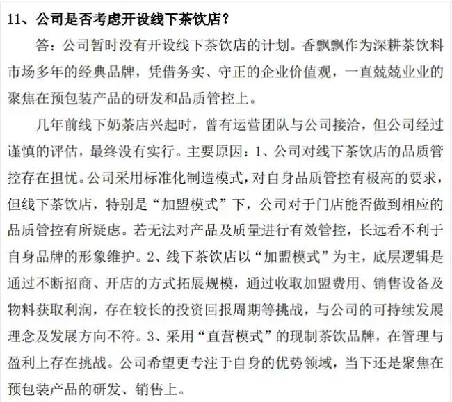 针对投资者当时对于香飘飘是否开设线下店质疑时,香飘飘曾明确表示,线下快闪店只是为新品造势的营销行为,暂时没有开设线下实体店的计划,预包装产品与茶饮连锁店在商业模式等方面有本质区别。