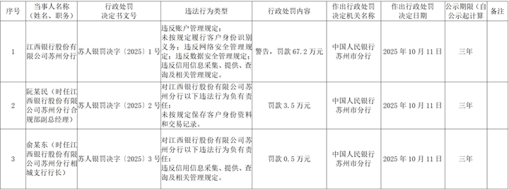 同日,中国人民银行苏州市分行官网显示,江西银行苏州分行也因违反账户管理规定,违反信用信息采集、提供、查询及相关管理规定等五项违规行为,被警告并罚款67.2万元,该分行三名相关责任人同时被罚款。