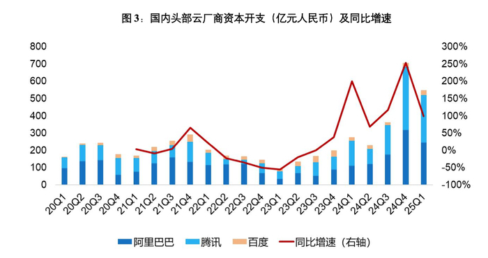 同时,国内互联网厂商也在逐步加大对AI相关业务的投入。今年一季度,仅阿里巴巴、腾讯、百度三家互联网大厂的合计资本开支为550.12亿元,同比增速99.38%。
