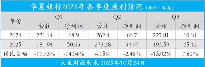 从各季度盈利情况来看,与2024年相比,华夏银行Q1营收、净利润均实现下滑;净利润在Q2同比下滑,Q3开始实现同比增长;营收则是在Q2实现同比增长,但Q3实现同比下滑,且降幅较大。