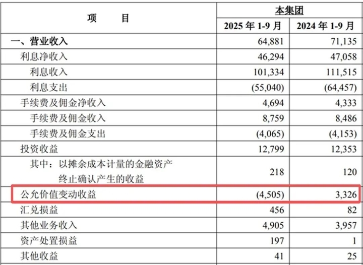 此外,该行前三季度公允价值变动收益实现大幅下滑,公允价值变动收益实现亏损,为45.05亿元,而去年同期为实现收益33.26亿元。