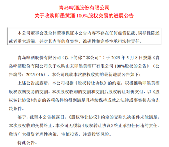 广受业界关注的即墨黄酒收购案尘埃落定。青岛啤酒(600600)10月26日发布公告,此前公司披露拟收购山东即墨黄酒厂有限公司100%股权,截至公告披露日,《股权转让协议》约定的交割先决条件未能满足,本次股权收购交易终止。
