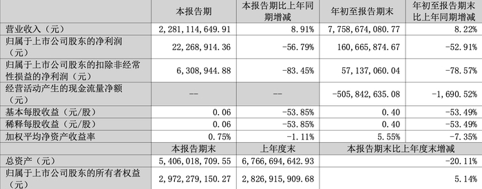 如果仅观察第三季度单季表现,该公司营业收入为22.81亿元,同比增长8.91%;但净利润仅为2226.9万元,同比降幅达到56.79%。