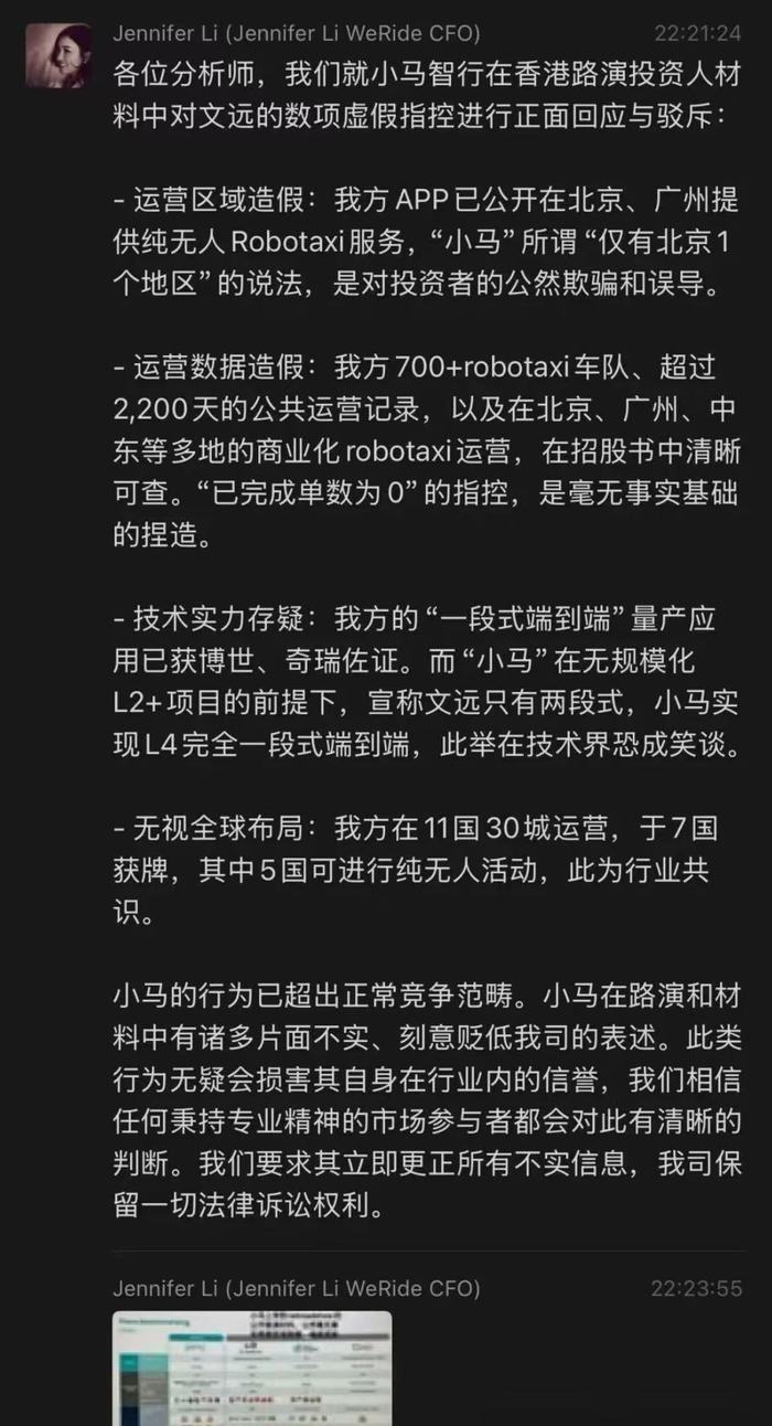 10月30日晚,文远知行首席财务官李璇在一场分析师社群沟通中,直接指责小马智行在港股路演材料中,存在大量针对文远知行的“片面不实、刻意贬低”的表述。她要求对方立即更正所有不实信息,并明确表示文远知行“保留一切法律诉讼权利”。