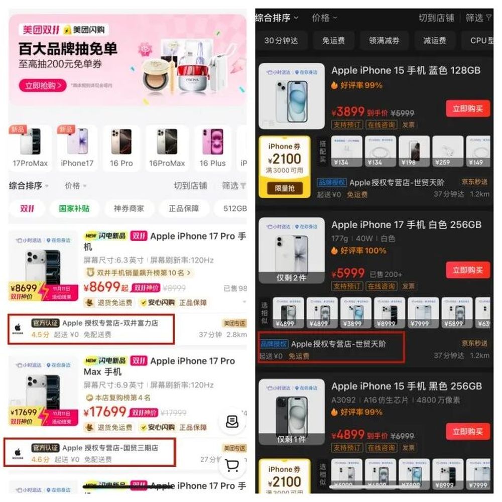 而美团闪购、京东秒送的合作方也均为苹果官方的授权专营店。9月19日,美团闪购宣布iPhone 17系列新品在其全国Apple授权专营店同步开售,提供正品现货30分钟送达服务。