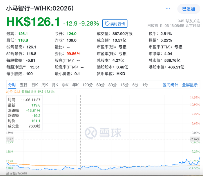 11月6日开盘,两家公司股价快速下跌。小马智行(2026.HK)以每股139港元发行,开盘即破发,盘中跌幅一度超过14%。文远知行(0800.HK)发行价27.1港元,全天股价承压,跌幅一度超过15%。