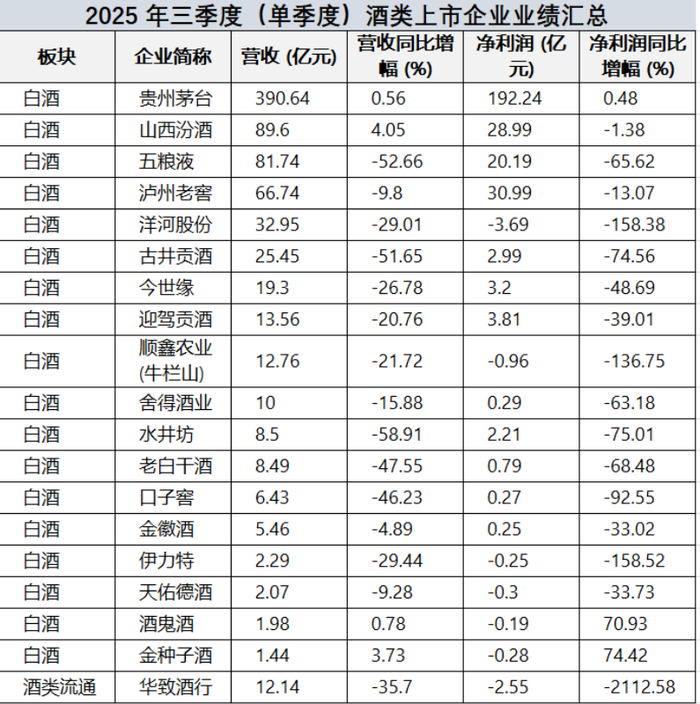 财报显示,19家白酒上市企业2025年前三季度实现营业收入累计达3176.58亿元,同比下降5.84%。其中,第三季度数据更为明显,15家企业营收同比下降,16家出现净利润同比下滑,单季跌幅均创下2014年行业调整期后的新高。