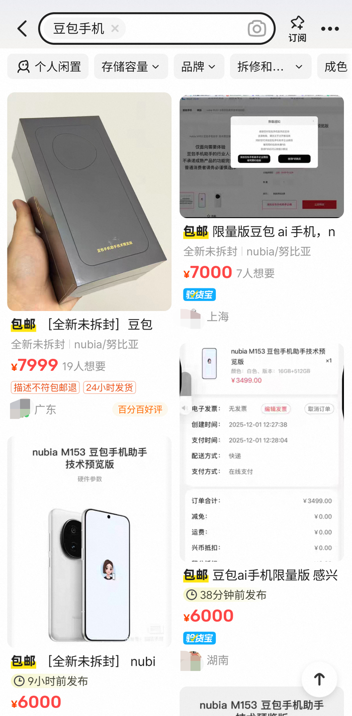 12月1日,字节跳动旗下AI助手豆包与中兴通讯合作推出的nubiaM153工程机启动小批量发售,官方售价3499元,首销备货量约3万台。不过,由于这是目前唯一一款将豆包嵌入底层操作系统的手机,可实现与系统的深度交互,引发了众多手机发烧友的追捧,其在二手平台的标价甚至达到7999元,溢价率达128.61%。