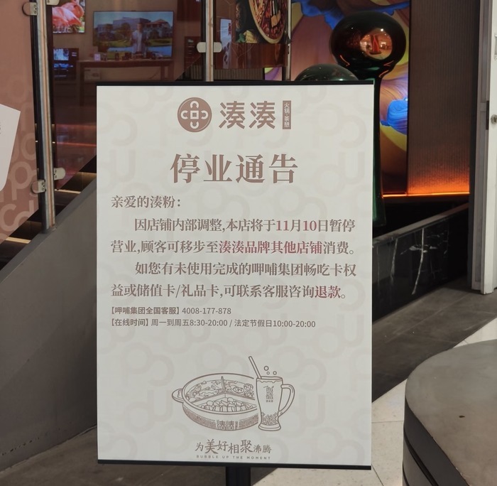 此前坐落于济南槐荫区和谐广场的湊湊火锅店,其店铺外已张贴出停业通知,明确因“店铺内部调整”,已于2025年11月30日暂停对外营业。据该店负责人此前透露,闭店决策由公司层面制定,其本人并不了解具体详情。
