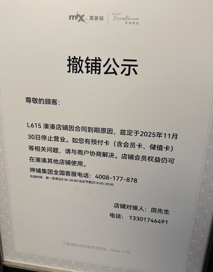 新黄河记者同步获悉,青岛万象城的湊湊火锅门店同样已停止运营。该店张贴的撤铺公示标注闭店原因是“合同到期”,停业时间与济南和谐广场店一致,均为2025年11月30日。不过该门店的对接人员此前曾透露,实际闭店缘由是“经营状况不佳”,且目前暂无在青岛重启门店的规划。随着青岛万象城店的关停,湊湊火锅在山东地区的门店数量缩减至2家,分别是济南万象城店和青岛崂山万象汇店。