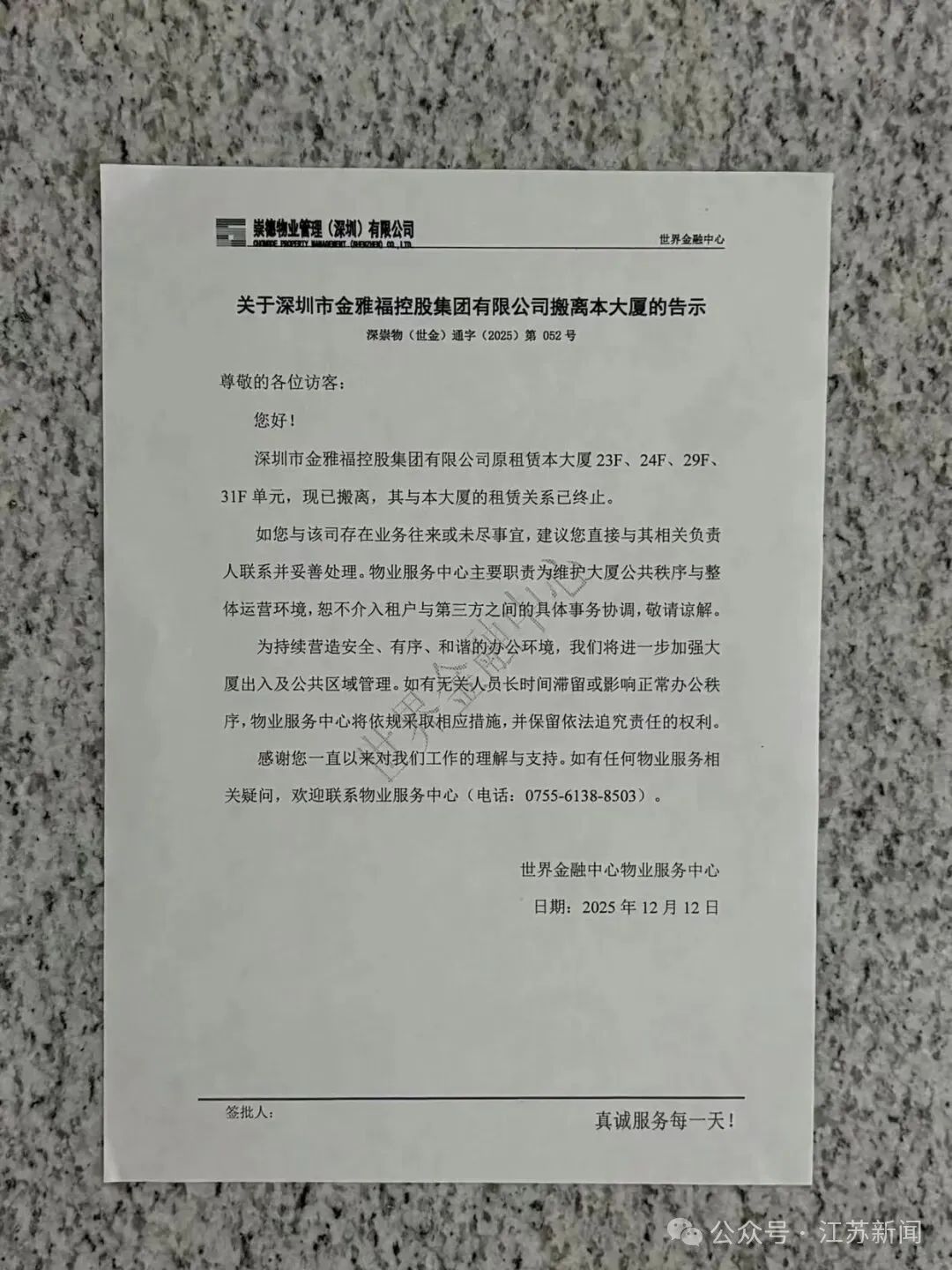 在办公室门前,落款日期为12月12日的物业中心告示称,金雅福已搬离,与大厦租赁关系终止。