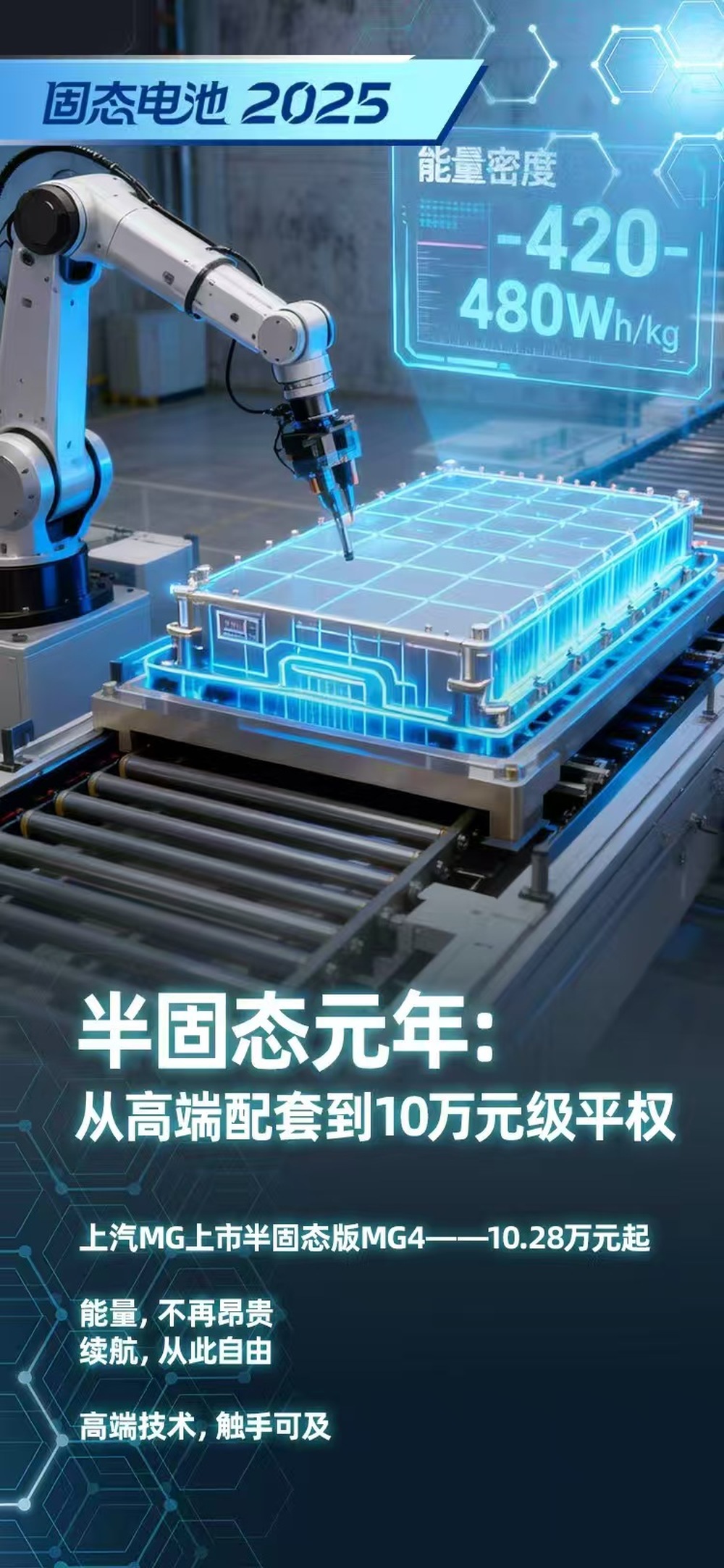 最具标志性的转折发生在10月20日,上汽MG上市半固态版MG4,售价仅为10.28万元。这一价格锚点彻底打破了半固态电池“昂贵”的刻板印象,推动技术进入平权时代。