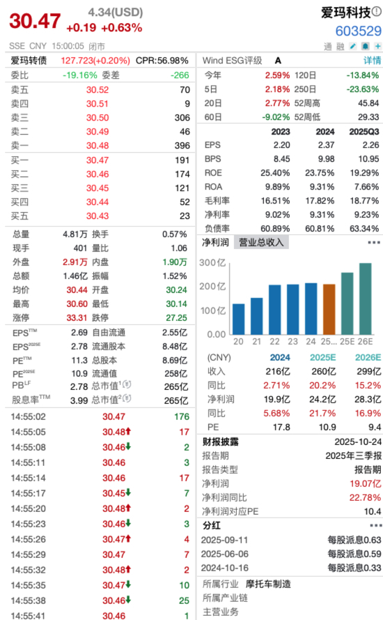 截至8日收盘,爱玛科技(603529.SH)报30.47元/股,涨0.63%,总市值265亿元。
