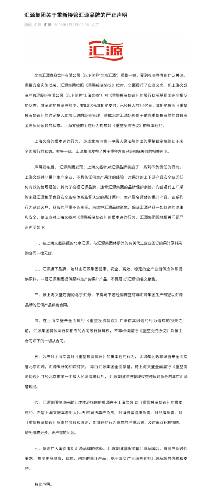 近日,北京汇源重整案迎来惊天逆转。1月8日,汇源集团发布严正声明,痛斥重整投资人上海文盛根本违约,不仅拖欠巨额投资款,更涉嫌窃据品牌、生产假冒果汁。