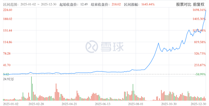 从2025年年初的5.25元/股飙升至年末的224元/股,市值一度突破260亿元,堪称年度“最牛妖股”。