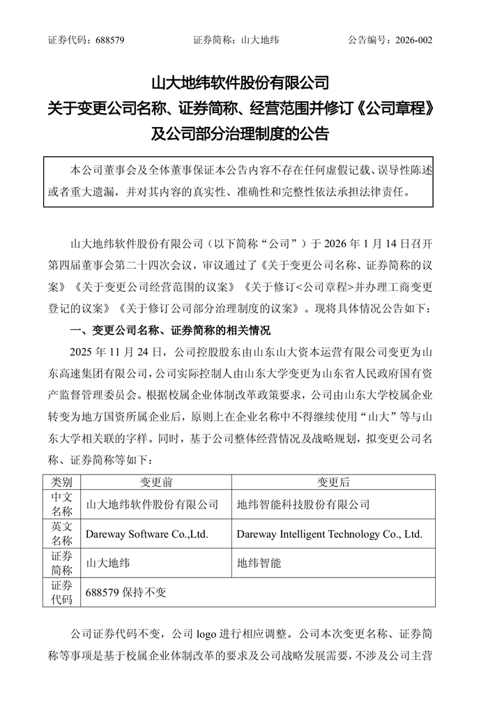 1月14日晚,山大地纬软件股份有限公司(688579.SH)公告称,拟更名为“地纬智能科技股份有限公司”,证券简称变更为“地纬智能”,证券代码不变。