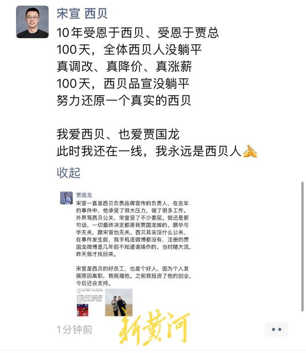 12时许,新黄河大鱼财经记者注意到,宋宣转发贾国龙朋友圈截图证实离职,并表示,“10年受恩于西贝、贾总,100天,全体西贝人没躺平,真调改、真降价、真涨薪;100天,西贝品宣没躺平,努力还原一个真实的西贝。我爱西贝,也爱贾国龙,此时我还在一线,我永远是西贝人。”