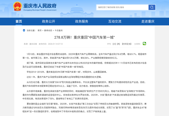 重庆已于1月13日率先公布全年数据,凭借全年总产量278.8万辆、同比增长9.7%的数据,稳居城市第一位、省市第三位。