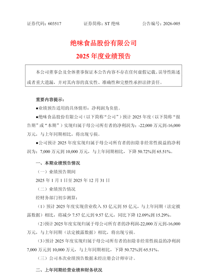 1月22日,ST绝味(603517.SH)发布公告,预计2025年度归母净利润亏损1.6亿元至2.2亿元。需要说明的是,这是其自2017年上市以来首次年度亏损,上年同期为盈利2.27亿元。