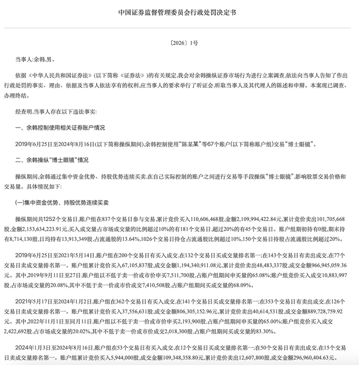 跨度长达五年的操纵案迎来终局。证监会发布的2026年1号行政处罚决定书显示,自然人余韩因控制67个账户操纵博士眼镜,被没收违法所得5.1亿元并处以等额罚款,罚没总额高达10.2亿元。